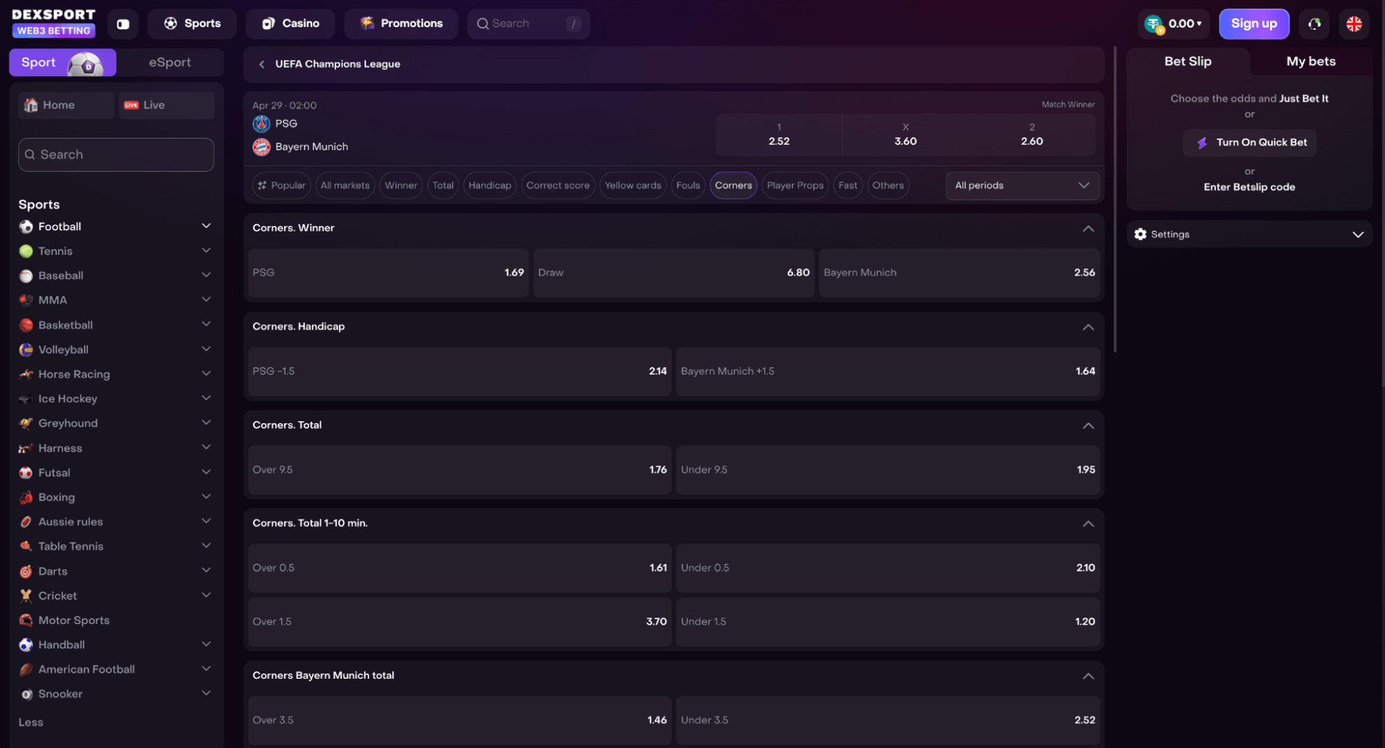 Football comes first. Dexsport covers the Champions League, top European leagues, and international tournaments. On big matches, you get 100–200 markets. Winner, totals, corners, cards, player stats, specific intervals.