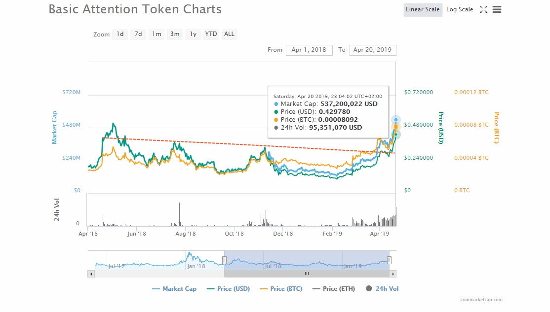 While keeping in mind that a positive sentiment is flowing and standing out in the crypto-verse, impacting the current increase which BAT‘s price is appreciating right now could be the clear that it experienced few days ago of the declining trend since the first quarter of 2018. Keeping in mind that the cryptocoins tend to move following the crypto-pioneer’s performance BTC, so a slight pullback could be due droing to the lows of $0.4000.