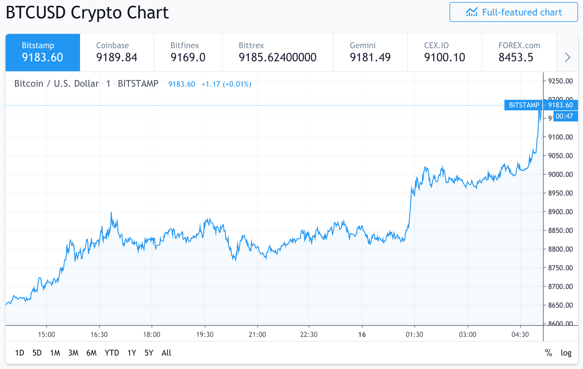 Gains of around 5.40% for the 24h period pushed the Bitcoin price past the $9,000 price level on most exchanges.