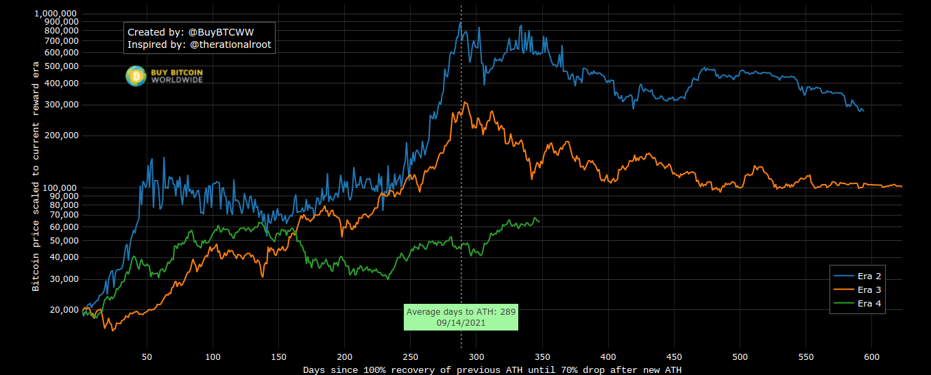 “When we overlay the cycles like this, we can see how the current cycle is not directly like either of the previous cycles but is in fact a combination of the two. With a more muted potential double-top playing out compared to 2013, and less consistency than 2017,” the update read.