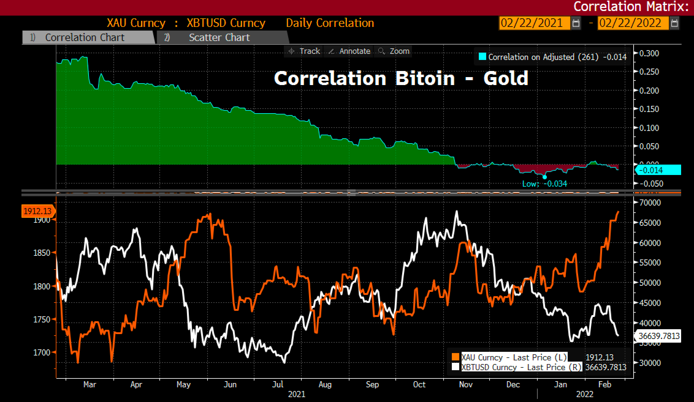 "Digital gold (Bitcoin) has plummeted to <$37k, while Gold has risen >$1900/oz. Correlation between digital & analog Gold is now even neg. Narrative that digital Gold is better way to escape has not panned out in Ukraine."