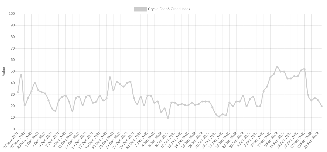 Sentiment also took a hit from the latest events, with the Crypto Fear & Greed Index down to 20/100 — well within the "extreme fear" bracket.