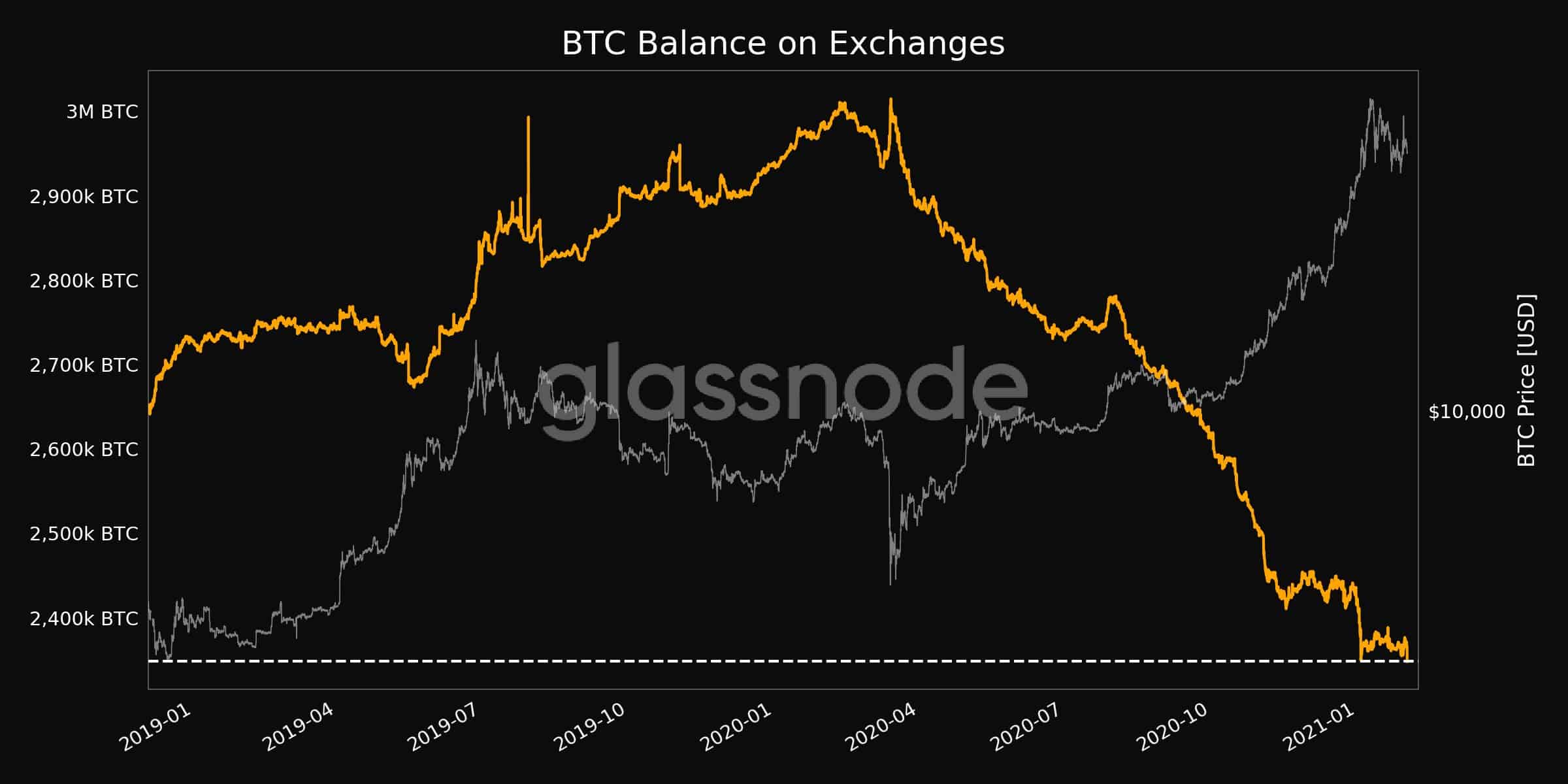For instance, the BTC balance kept on exchanges has reached a two-year low of a little over 2.3 billion coins. The previous such record was approximately a month ago – shortly prior to bitcoin’s price peak at $42,000.