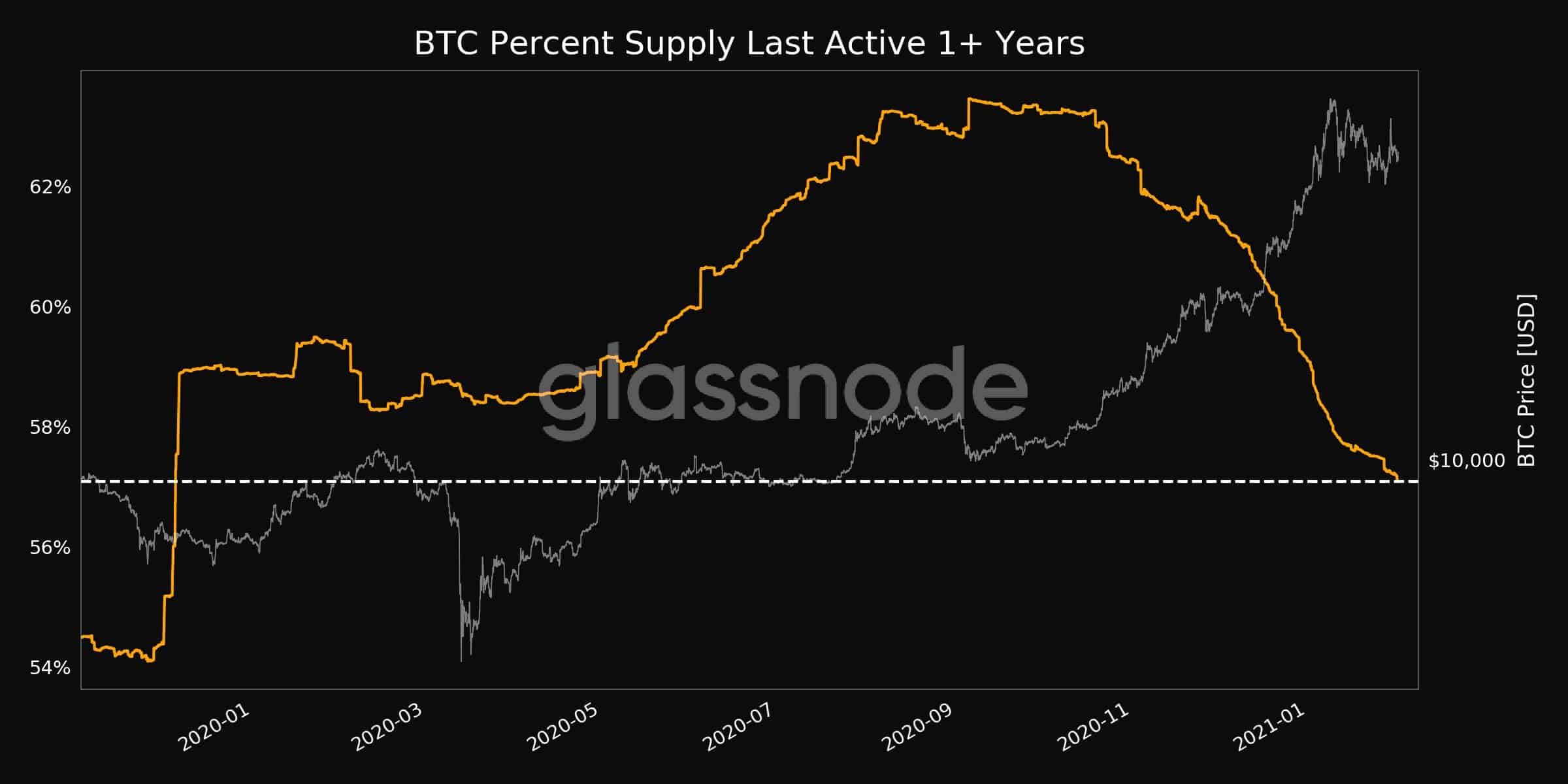 Separately, the supply of coins that have not moved in one year or more has reached a 13-month low of 57%. This is a substantial decline from mid-2019 when the same metric was at nearly 65%.