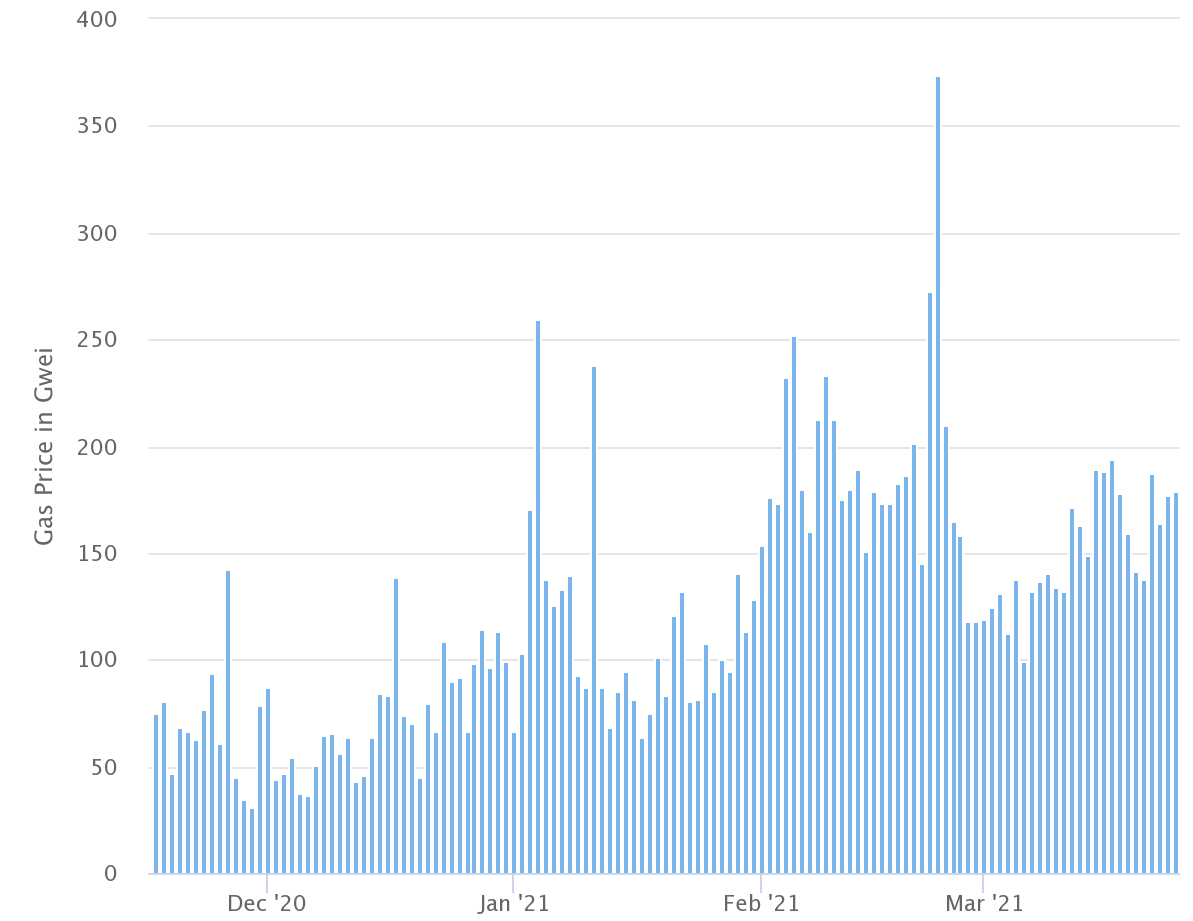 If you compare this chart of the average gas fees on Etherum with the chart above detailing the monthly trading volume on PancakeSwap, a correlation can be seen between higher fees and more activity on the DeFi platform.