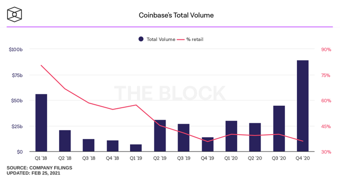 Further evidence suggests that Bitcoin’s current price action is driven by institutions unlike the previous bull-run in 2017. Besides from Google search volume for “Bitcoin” is at a relatively low, Coinbase trading volume has skyrocketed since Q3 and Q4, 2020.