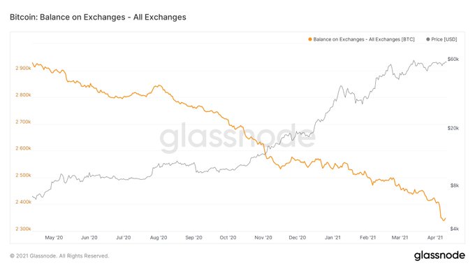 Two additional key metrics are the percentages of BTC trading above 1 Trillion USD market cap and the amount of BTC on exchanges. The former is estimated at 11% as BTC’s price trades above $53,000 which points to a “validation” of the current price, as stated by analyst William Clemente.