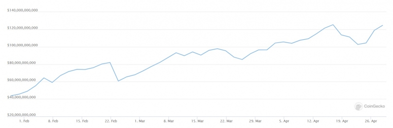 The following chart is from a CoinGecko page that tracks the combined market cap of all DeFi tokens: