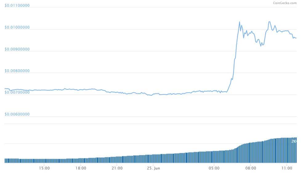 Moreover, the cryptocurrency is up around $30.9% in the last 7 days and around 30% in the last month. As you can see on the chart, the spike was sudden and the majority of the gains were made in about 40 minutes.