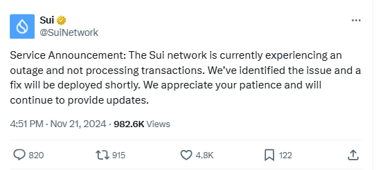 The blockchain network stopped producing blocks for a total of two and a half hours, from approximately 1:15 to 3:45 am Pacific time on November 21st. The Sui Network validators entered a crash loop, preventing the blockchain protocol from processing any transactions.