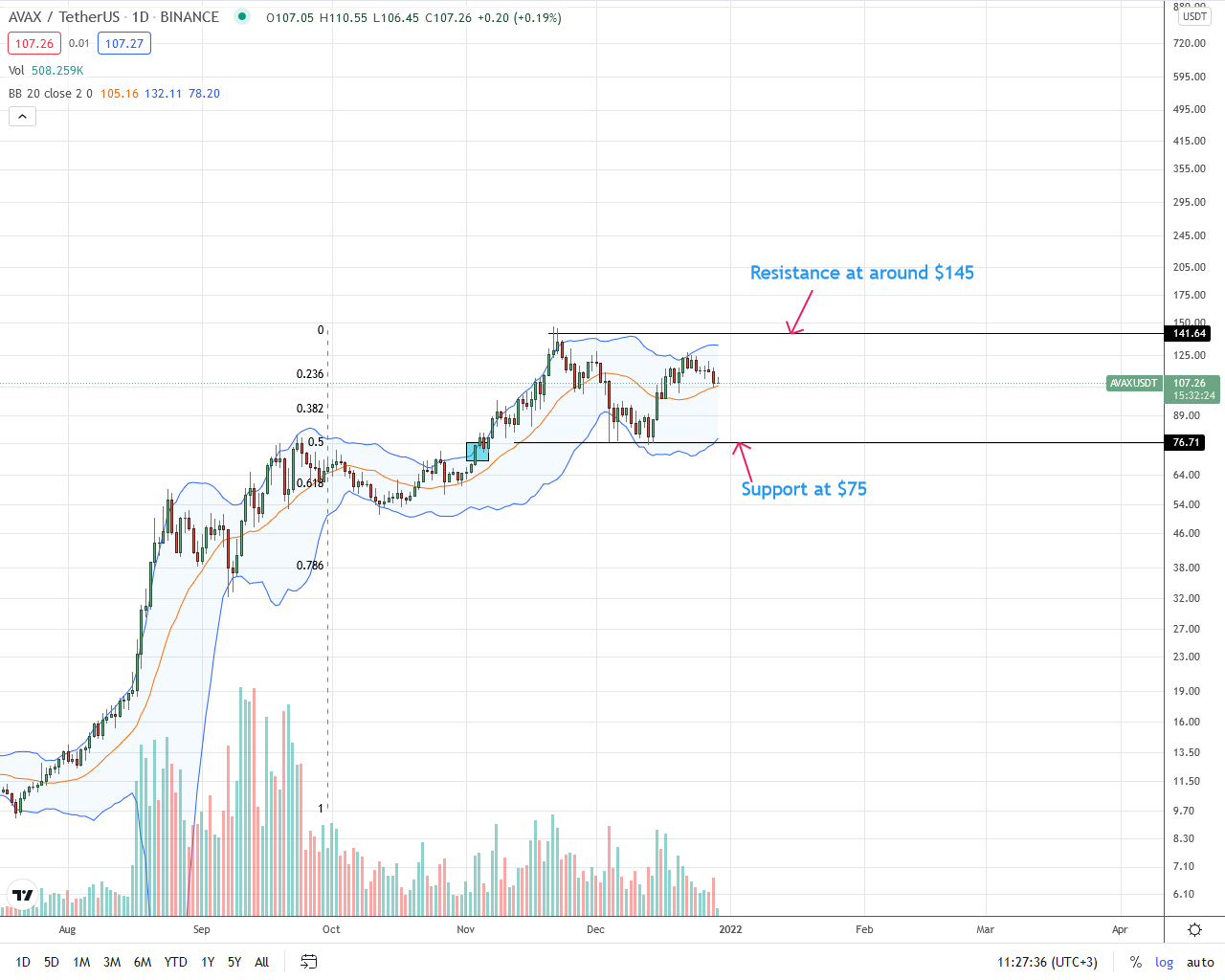 After a 13.5X surge to new all-time highs, AVAXUSDT prices are cooling off as per the development in the daily chart. At spot rates, prices have contracted to retest primary support levels marked by Fibonacci retracement levels. If AVAX coin buyers keep prices above $100, bulls have the upper hand. Even so, the AVAX bullish structure will remain even if prices sink to December 2021 lows of around $75. Based on this, a recovery above $120 to unwind losses of December 28 would be ideal for an immediate buy trend continuation.