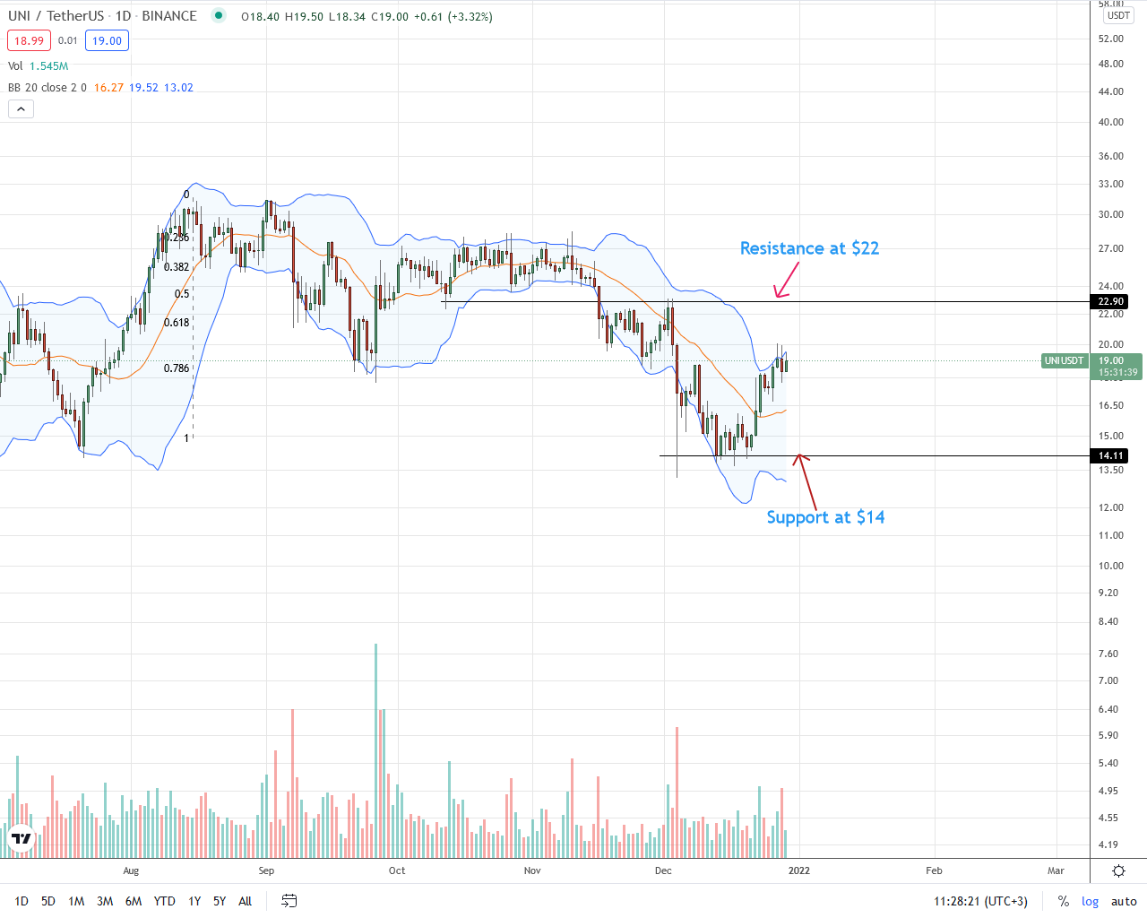 The path of least resistance is northwards in the short term. Because sellers didn't flow back to confirm losses of December 28, there might be more entry opportunities for aggressive Uniswap coin buyers. On the reverse side, losses below $17 might trigger a sell-off back towards the middle BB in a retest.