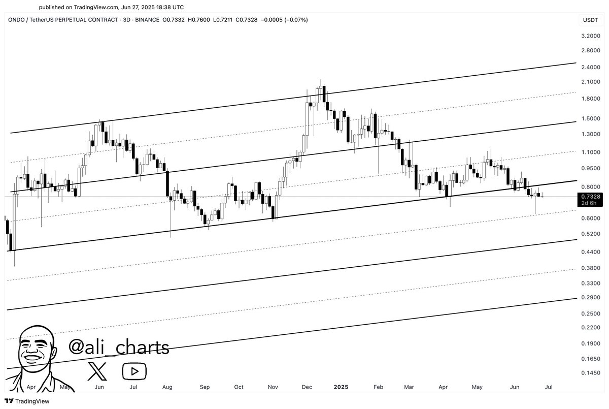 The mood around ONDO remains divided. Some investors view the dip as a healthy retrace in a broader uptrend, while others see it as the start of a more extended correction. Top analyst Ali Martinez has added to the cautious outlook, noting that ONDO is breaking out of an ascending channel to the downside—an often bearish signal. This pattern suggests that momentum is weakening and that the token could soon test lower demand zones.