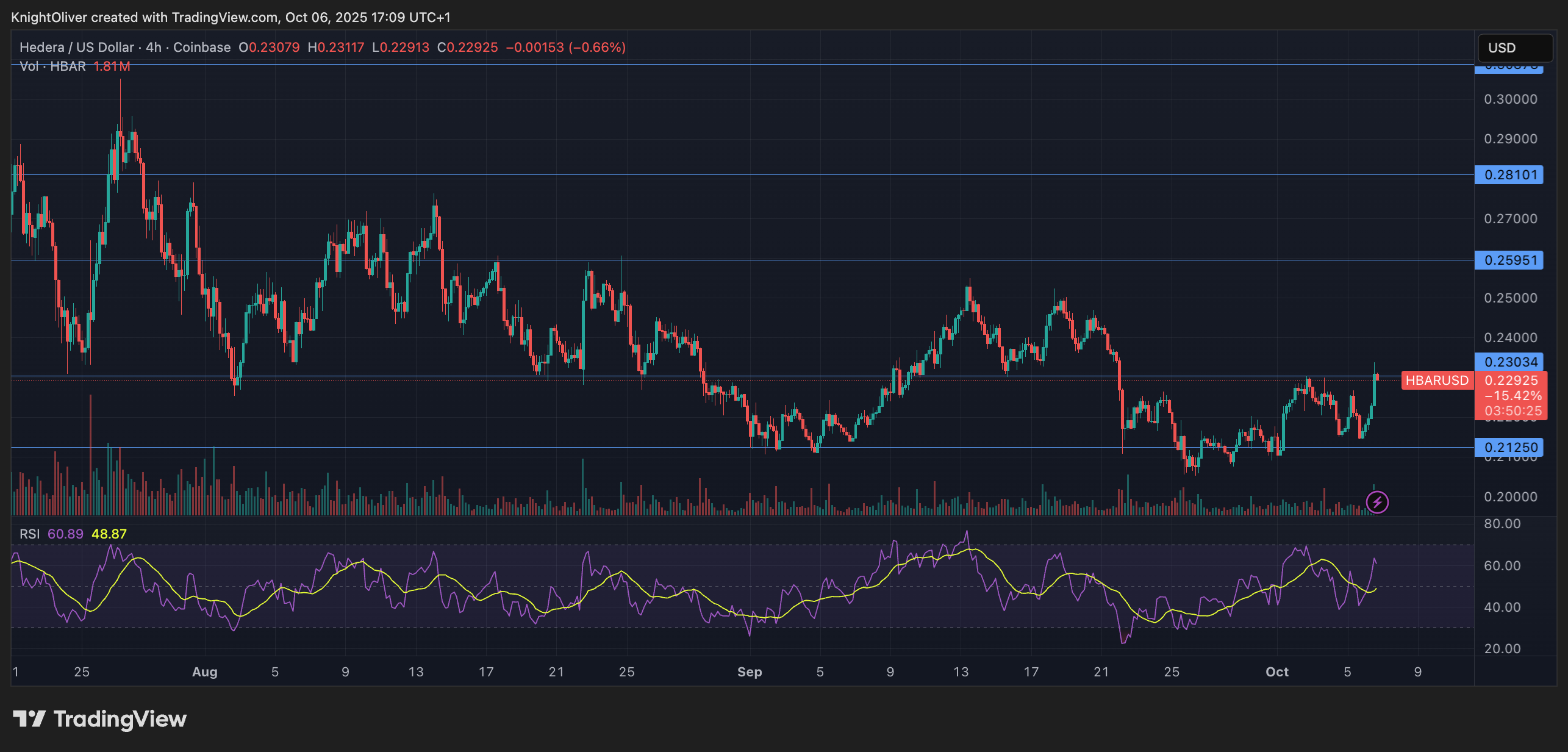 HBAR demonstrated notable bullish momentum over the past day, rising from $0.22 to $0.23 between Oct. 5 and Oct. 6 amid a 5.47% intraday volatility range.