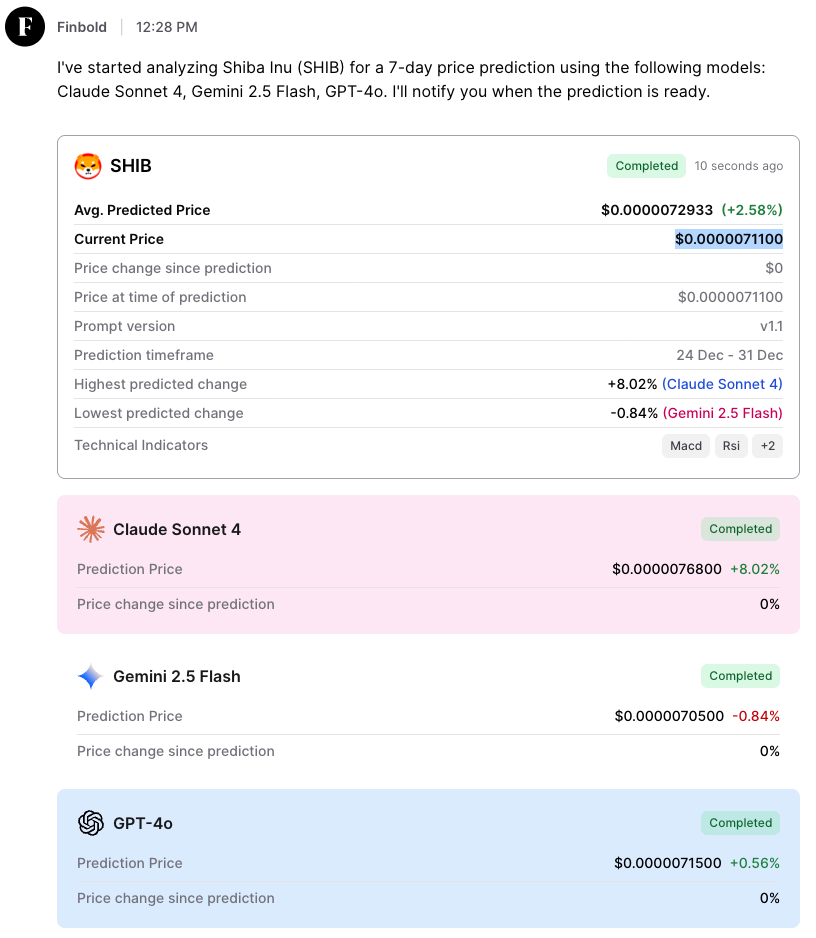 It’s worth noting that the Finbold AI model aggregates forecasts from several large language models. Among these, Claude Sonnet 4 offered the most bullish outlook, projecting SHIB at $0.00000768, implying upside of just over 8%. Gemini 2.5 Flash presented a more conservative scenario, forecasting a slight dip to $0.00000705, while GPT-4o pointed to a modest increase toward $0.00000715.