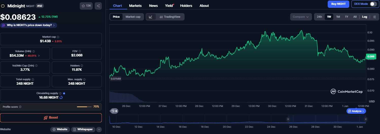 Midnight (NIGHT), a privacy-centric token built on the Cardano (ADA) network, was in many ways the defining launch of December 2025, surging to a $1 billion market capitalization within its first week.