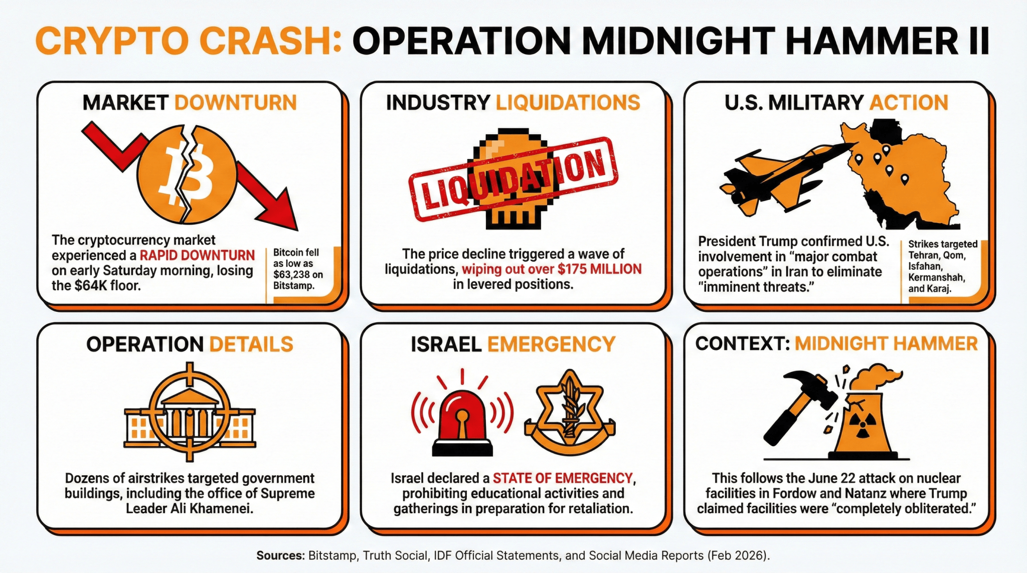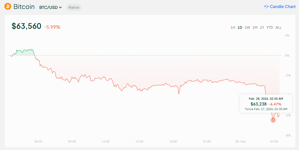 Bitcoin and the whole cryptocurrency market experienced a sharp fall on Saturday morning, after Israel and the U.S. launched a series of “preemptive strikes” on Iran following days of intense negotiations regarding Iran’s nuclear program. BTC lost the $64k support and kept falling.