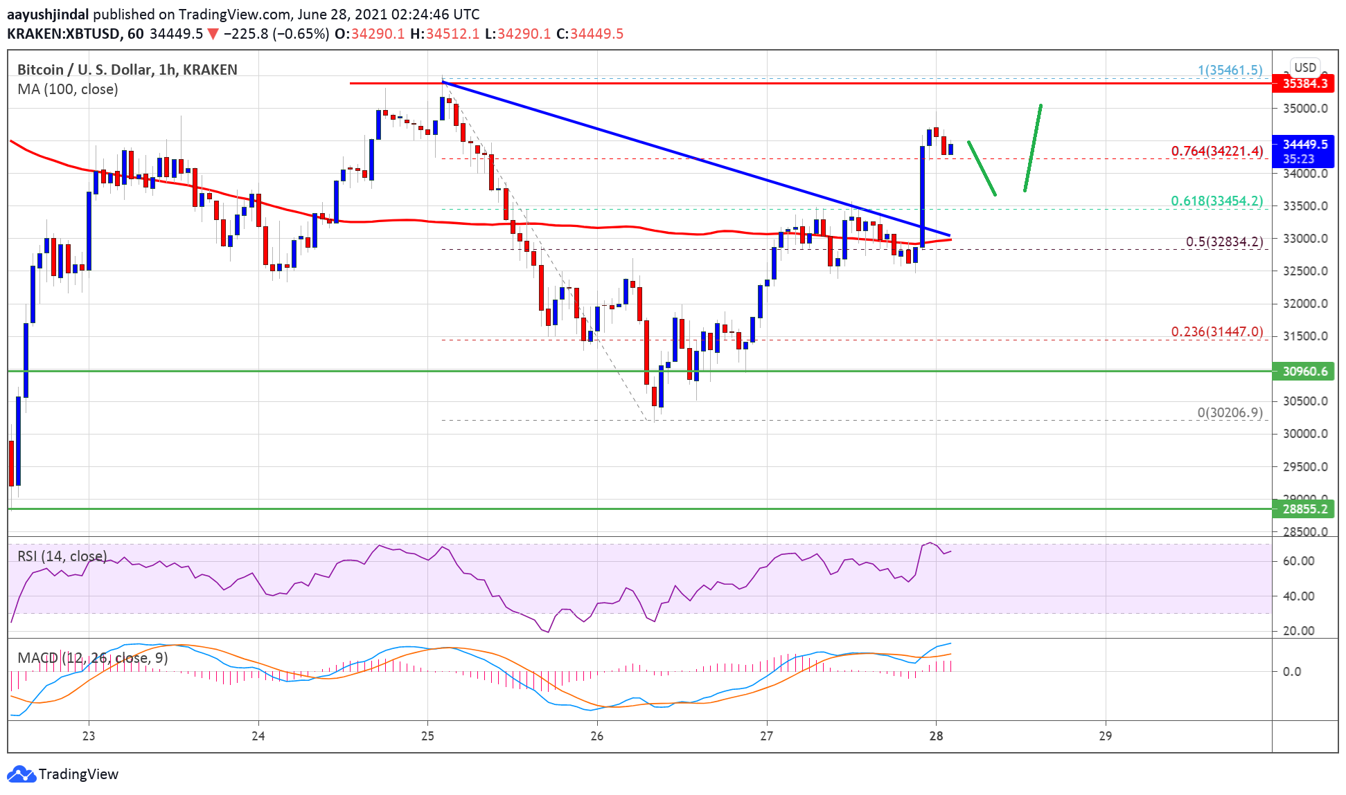 Bitcoin price regained strength for a fresh recovery and it broke $33,500 against the US Dollar. BTC is likely to continue higher above $35,000 in the near term.