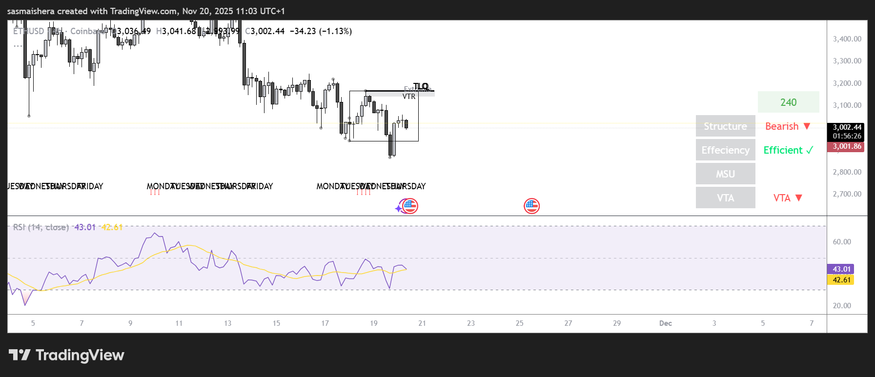 If the bearish trend continues, ETH could retest the $2,800 support level in the near term.