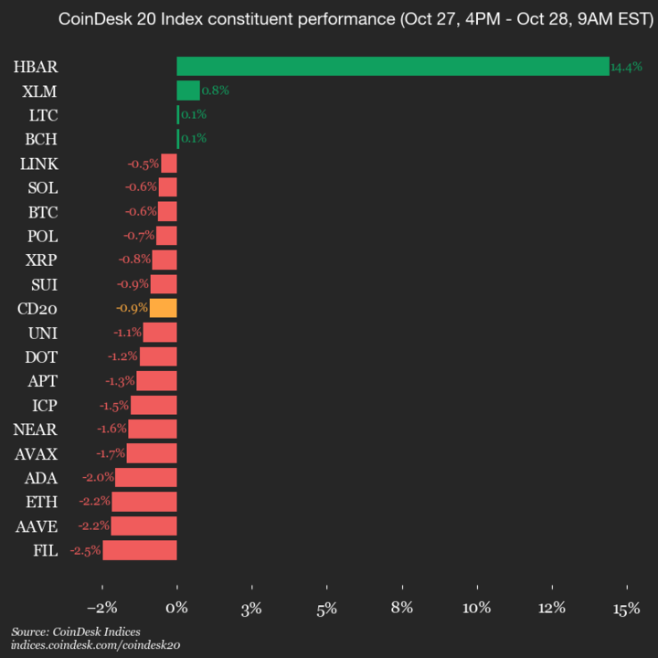 Leaders: HBAR (+14.4%) and XLM (+0.8%).