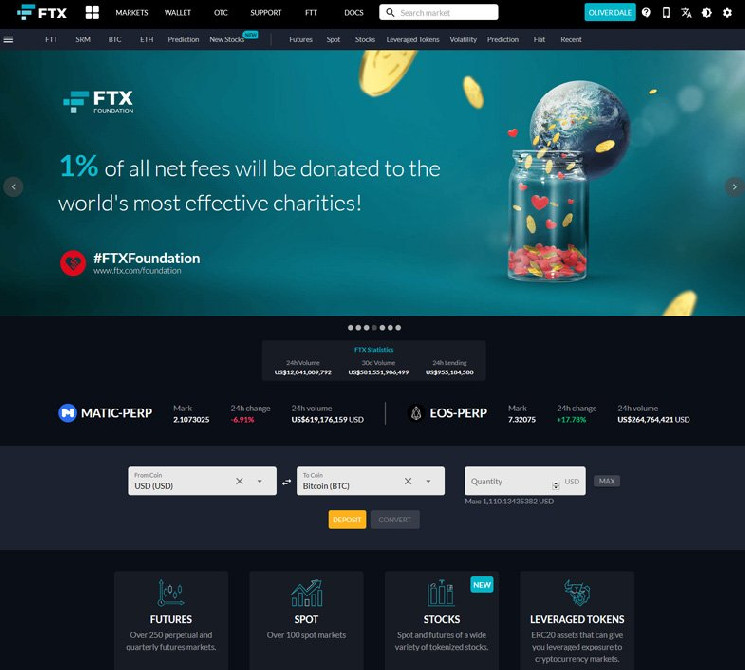 FTX es uno de los mejores intercambios para comprar monedas y fichas. Es un intercambio de activos múltiples centralizado líder que ofrece derivados, productos de volatilidad, NFT y productos apalancados. FTX también es compatible con las criptomonedas que se comercializan con mayor frecuencia.