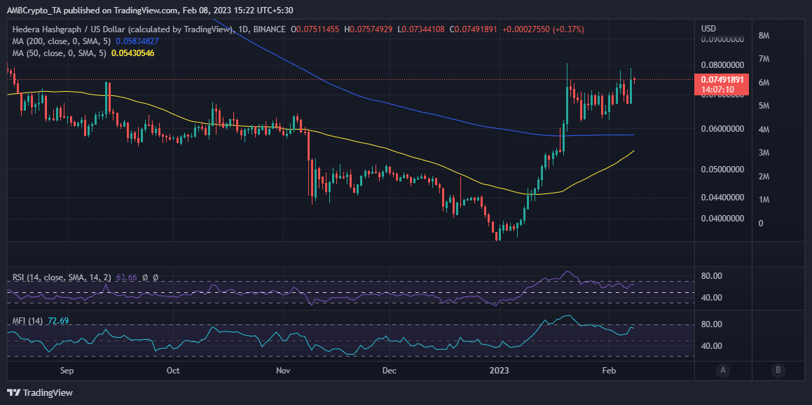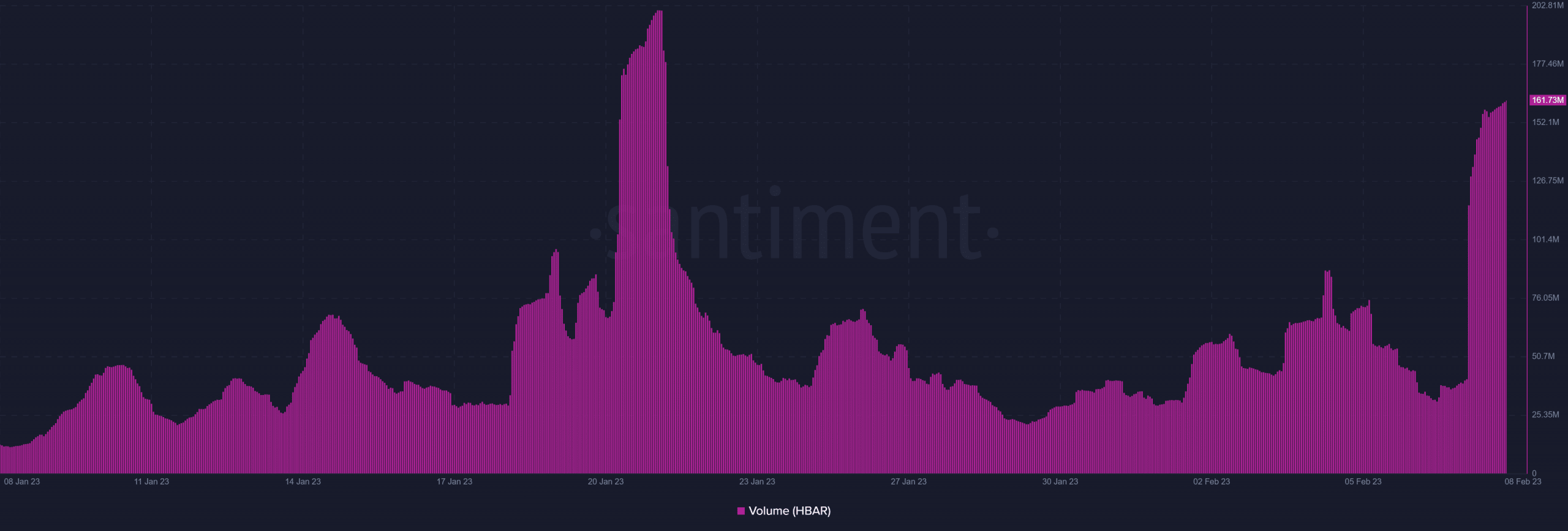 El volumen en cadena de HBAR experimentó un fuerte aumento en las últimas 24 horas. Este es el mayor aumento de volumen que ha logrado la criptomoneda en lo que va de mes. Esto es importante porque el precio se ha estancado en un rango durante la primera semana de febrero de 2023. En otras palabras, un cambio de volumen importante puede ayudar al precio a superar el limbo del momento de la publicación.
