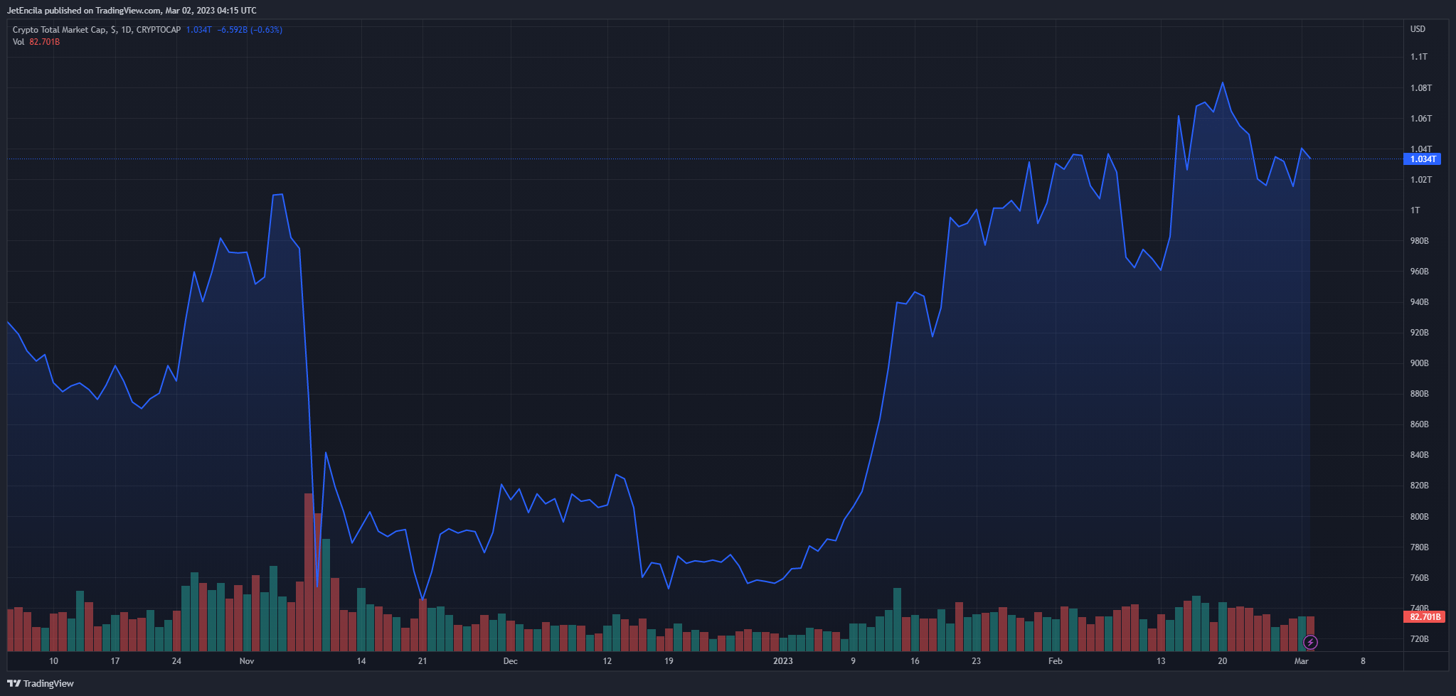 La capitalización de mercado total de todas las criptomonedas en el momento de escribir este artículo es de 1 billón de dólares, según muestran los datos de TradingView.
