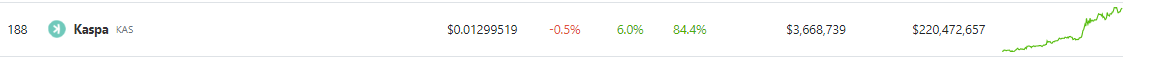 En el momento de escribir este artículo, KAS cotizaba a $ 0.0131, un aumento impresionante 84.5% y emergiendo como la única criptografía con un repunte tan masivo en las 200 monedas principales enumeradas por Coingecko.