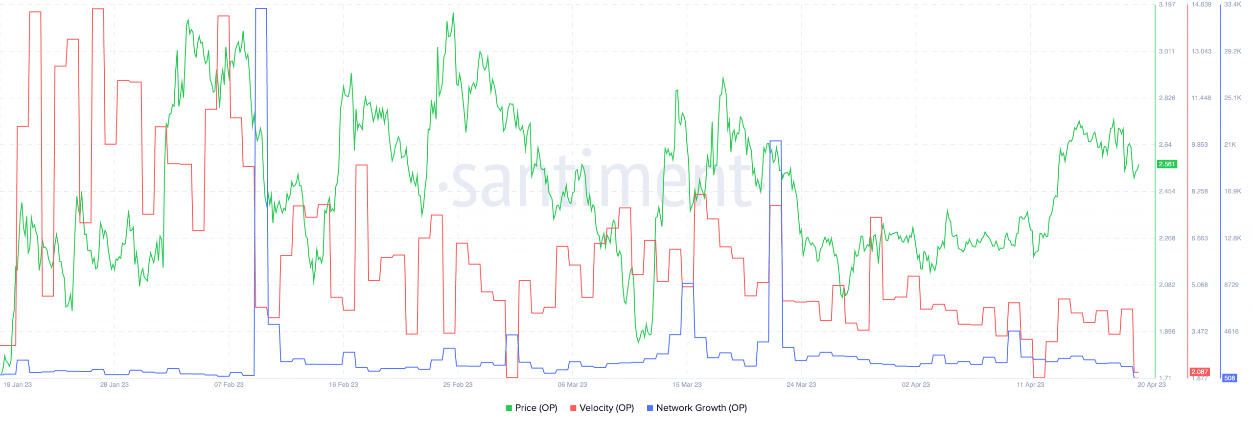 El token OP nativo de Optimism enfrentó las consecuencias de la información antes mencionada. Las últimas semanas vieron una caída drástica en la velocidad del token OP. Esto indicó que la frecuencia de negociación de OP fue testigo de una disminución. Junto con eso, el crecimiento de la red de OP comenzó a caer. Esto indicó además una caída en el número de nuevas direcciones que transfieren OP por primera vez.