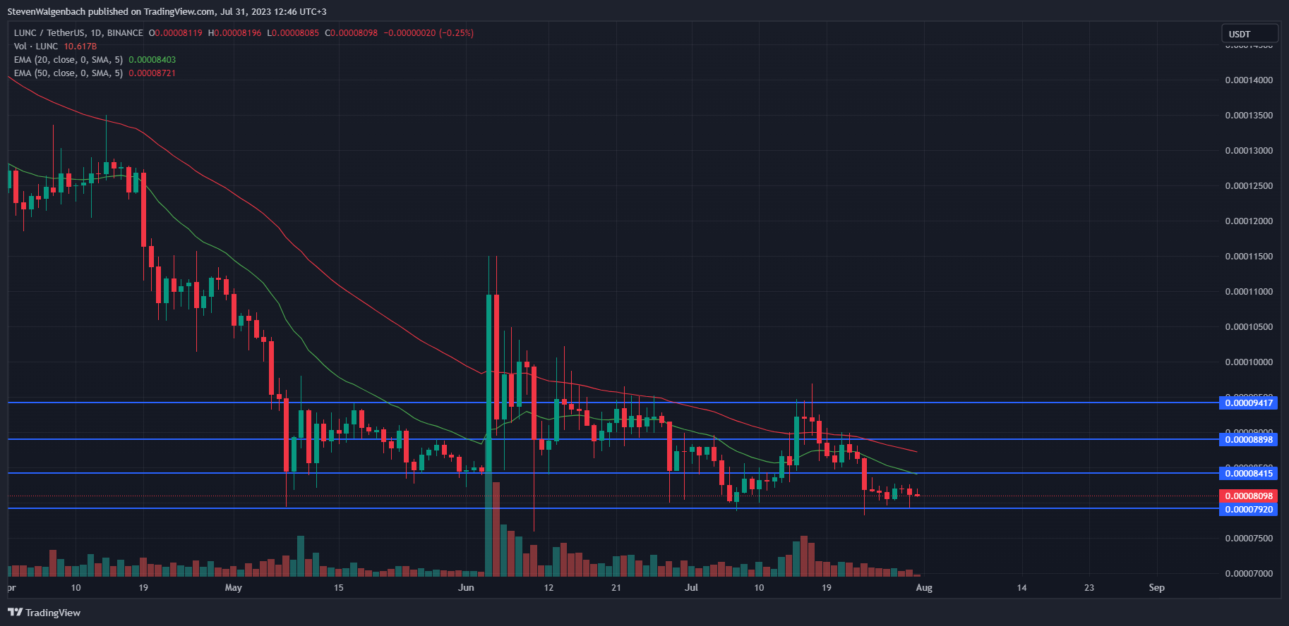 Terra Classic tiene el potencial de subir con el apoyo de la línea EMA de 20 días, despejando el camino hacia la resistencia de $0.00008898 y potencialmente hacia $0.00009417.