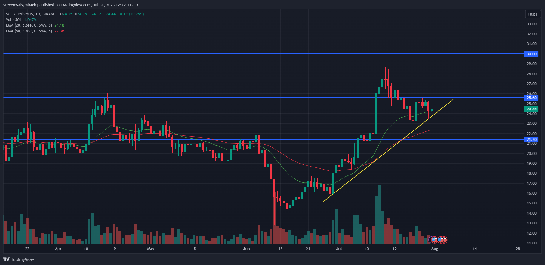 Solana ha enfrentado presiones bajistas, pero si logra cerrar por encima de la línea EMA de 20 días en $24.18, podría buscar recuperar el soporte de $25.60, abriendo el camino hacia $30.