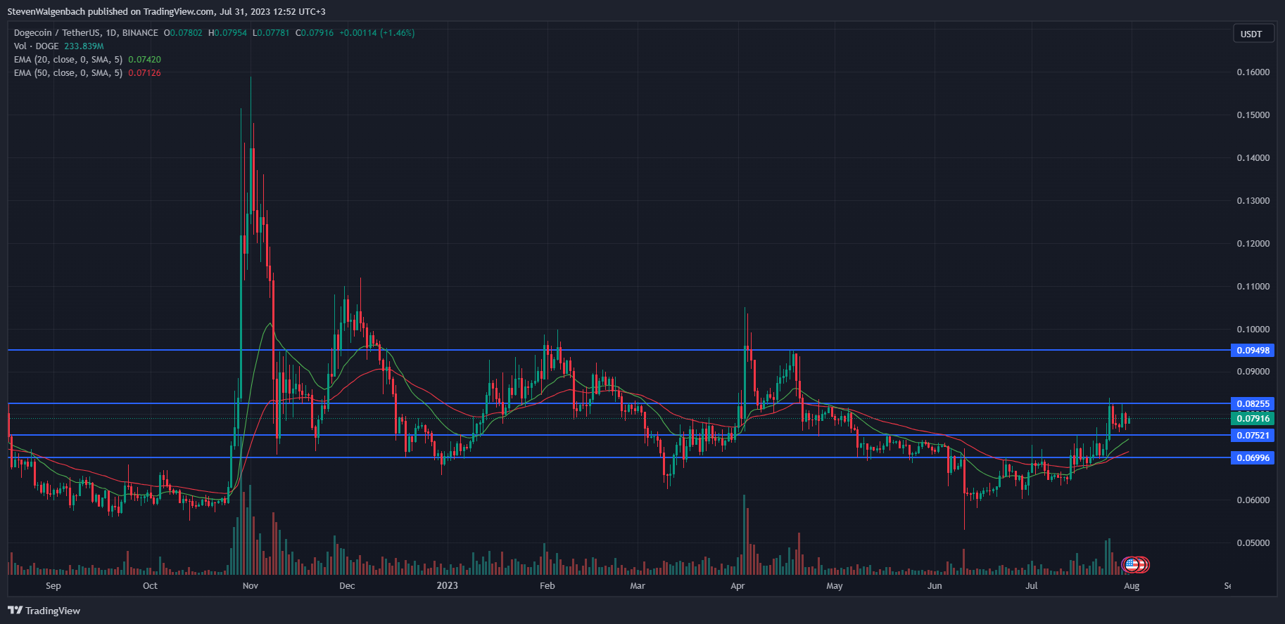 DOGE está en una fase de consolidación con el potencial de subir a $0.09498 en la semana siguiente si rompe $0.08255. La tendencia alcista se respalda por las EMAs de 20 y 50 días.