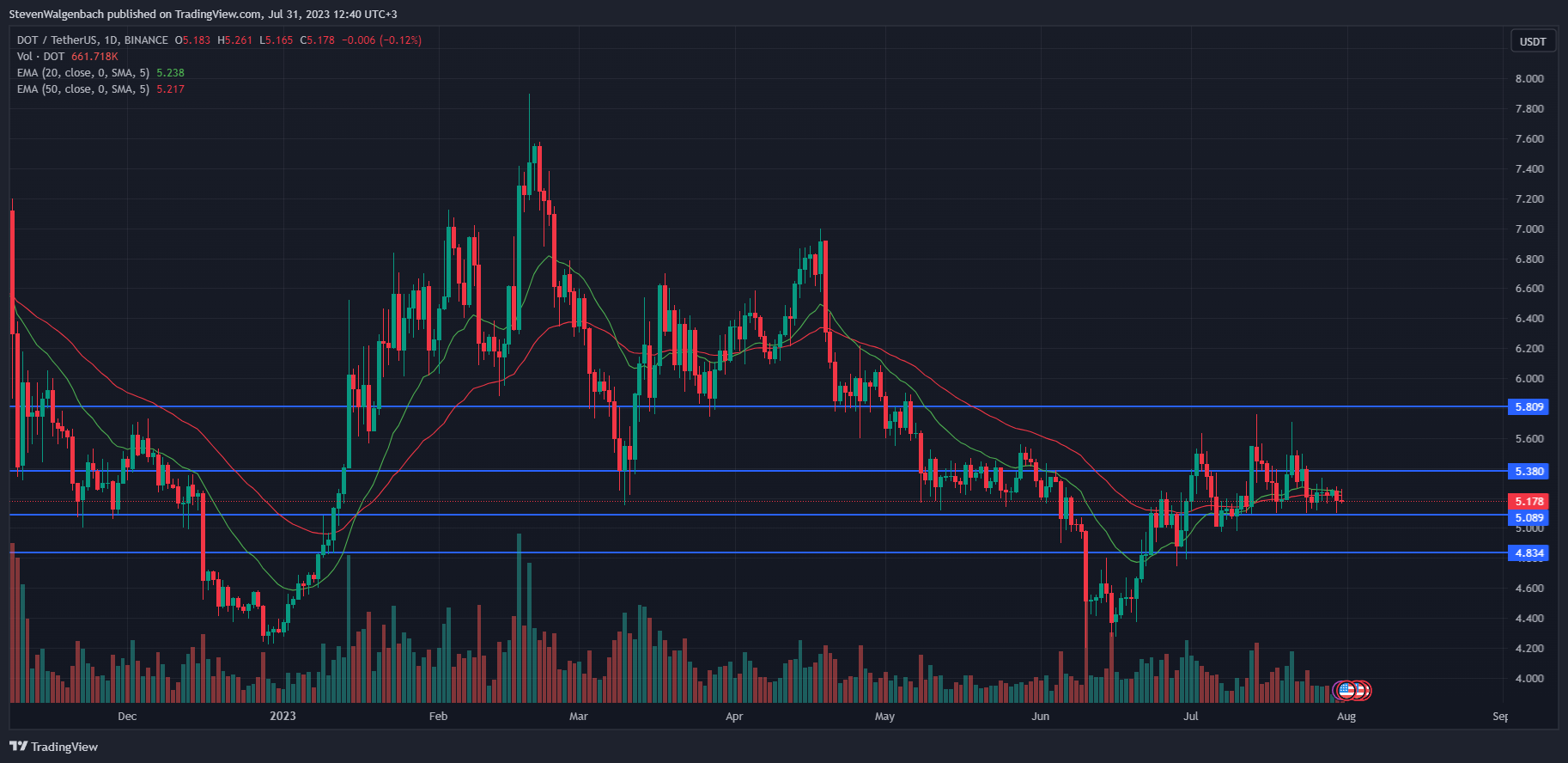 Polkadot corre el riesgo de caer si la EMA de 20 días rompe por debajo de la EMA de 50 días. Vigilar el nivel de soporte crucial en $5.08 será vital en las próximas 24-48 horas.
