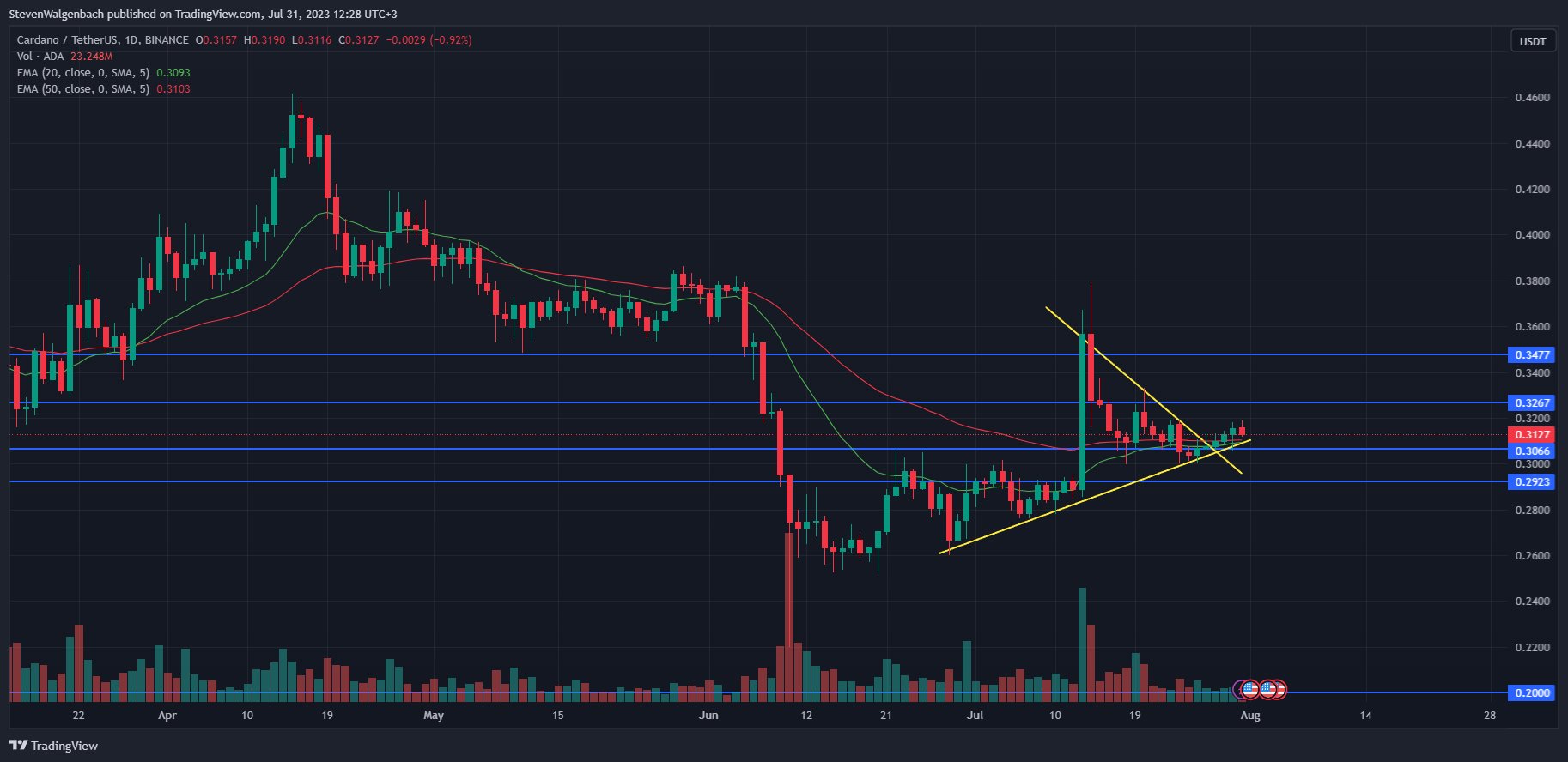 La línea EMA de 20 días cruzando la EMA de 50 días podría indicar una tendencia alcista para ADA. Los comerciantes deben mantener los ojos abiertos a esta señal técnica para capitalizar ganancias.