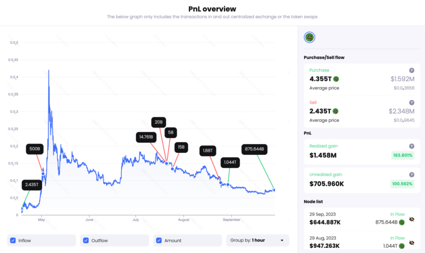 Este primer inversor ha apostado por la criptomoneda meme en dos ciclos. En la primera oportunidad, compró en abril 2,435 billones de PEPE por un total de 62,615 dólares. Posteriormente, vendió sus tokens por la asombrosa suma de 2,34 millones de dólares.