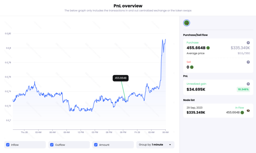 Por último, la ballena 0x1f5 ejecutó un intercambio de 335,349 dólares en la stablecoin USDT por 455.6 mil millones PEPE a un precio promedio de 0.000000736.