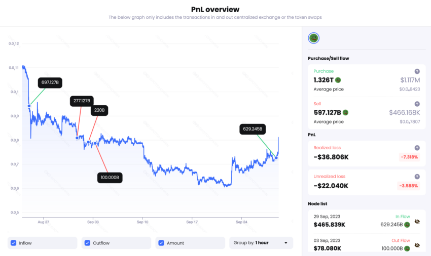 En el actual ciclo ha comprado PEPE en dos ocasiones, incluyendo la más reciente. Sin embargo, debido a la crisis que atraviesa el proyecto, acumula una pérdida no realizada de 41,300 dólares.