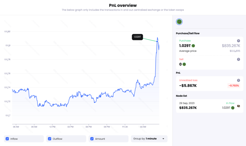 Spot On Chain también compartió un análisis exhaustivo sobre el movimiento de las ballenas de PEPE. En primer lugar, la ballena 0x710 compró 1,029 billones de tokens en Binance a 0.0000008115 dólares (un monto total aproximado de 835,000 dólares).