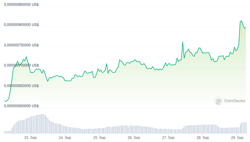 Al momento de la publicación, la criptomoneda meme cotiza en 0.000000796 dólares tras aumentar 10% en las últimas 24 horas, según CoinGecko. Al mismo tiempo, acumula ganancias del 31% a lo largo de la semana.