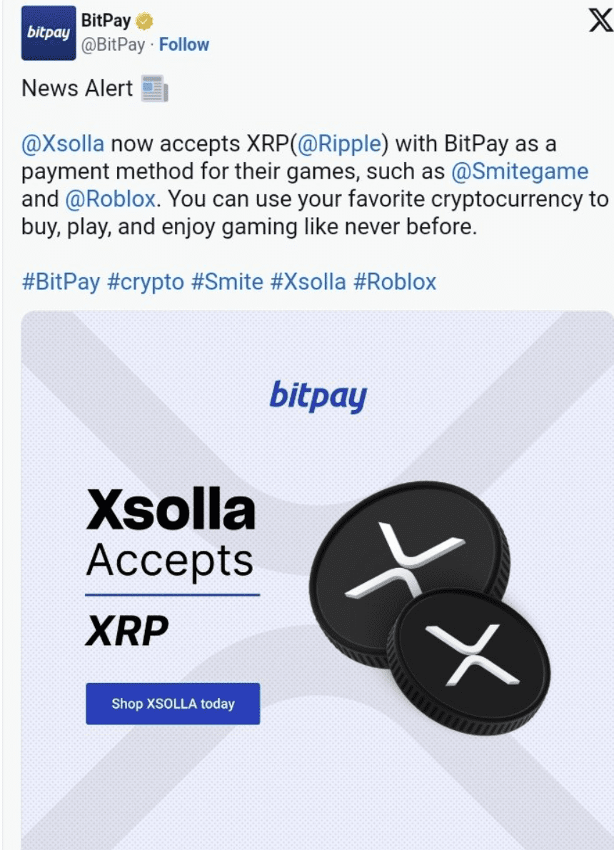 Bitpay, plataforma que facilita la conversión automática de los pagos de criptomonedas a dinero tradicional, publicó un tuit en el que decía «Xsolla ahora acepta XRP con BitPay como método de pago para sus juegos como Smite y Roblox. Puedes usar tu criptomoneda favorita para comprar, jugar y disfrutar de los juegos como nunca antes».