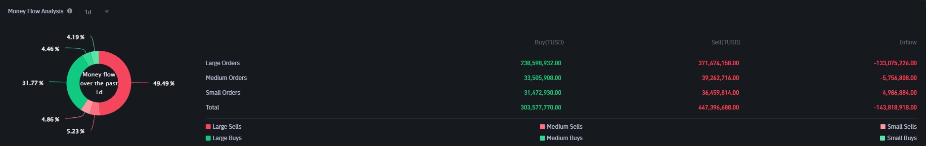 Al momento de la publicación, los operadores han vendido más de USD $447 millones de dólares en TUSD en las últimas 24 horas en Binance, en comparación con sólo 303 millones de dólares en órdenes de compra, lo que ha generado un flujo de entrada negativo superior a USD $143 millones, tomando en cuenta las órdenes de todos los tamaños.