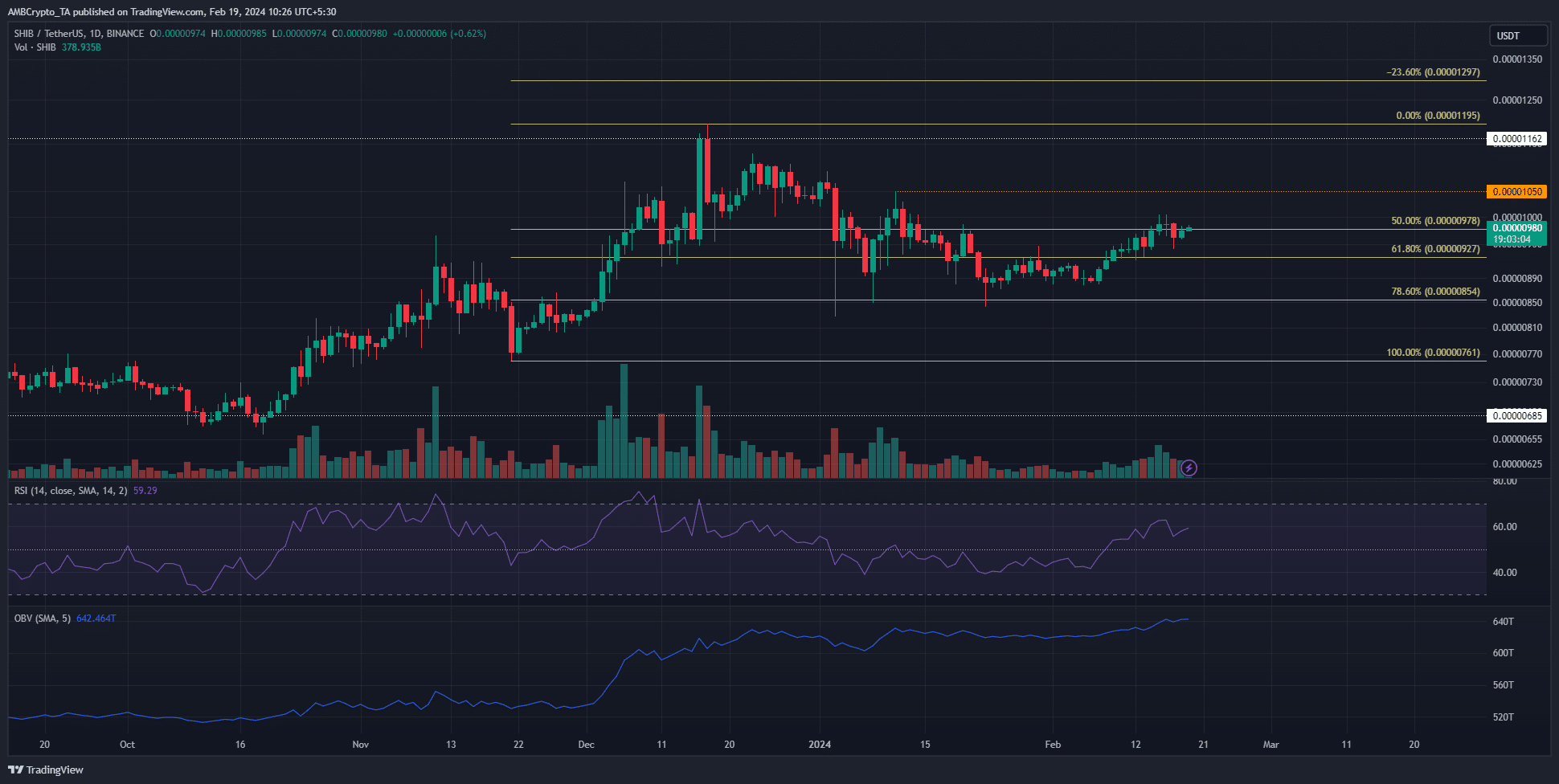 El gráfico de un día de Shiba Inu inspiró cierta confianza alcista. La estructura del mercado y el RSI mostraron que los compradores tenían el control. Al mismo tiempo, el OBV también tuvo una lenta tendencia al alza durante las últimas dos semanas.
