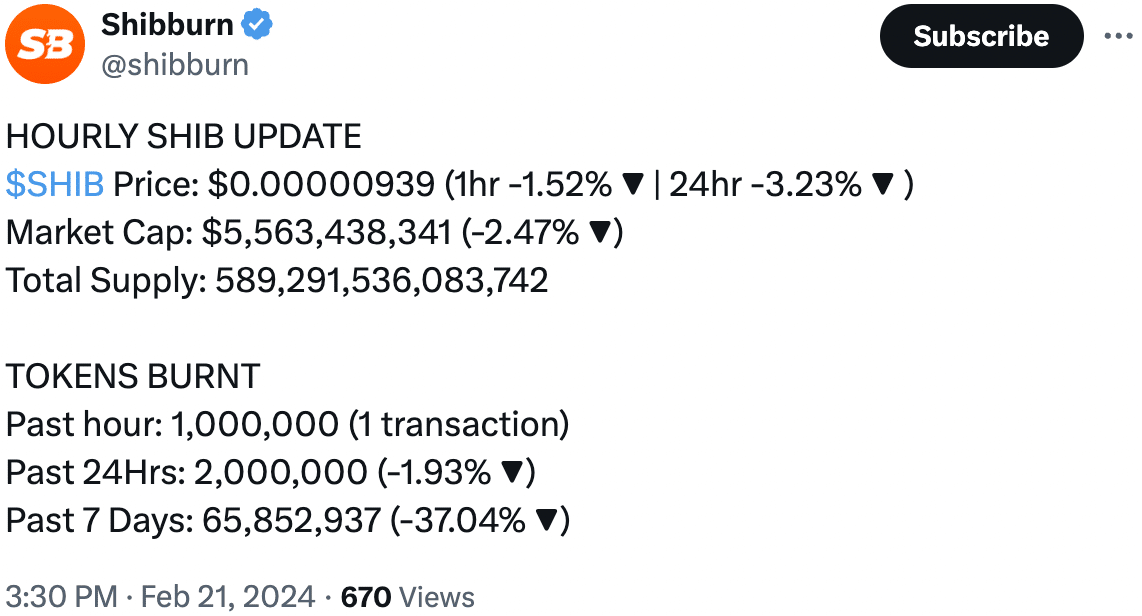 La quema de tokens $SHIB también puede contribuir al crecimiento del precio de $SHIB. En las últimas 24 horas se quemaron 2.000.000 de tokens $SHIB.