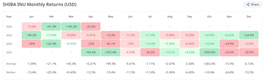 Sin embargo, ha habido un aumento aproximado del 2% en las últimas 24 horas. $SHIB se cotiza a $0.000025. Los analistas predicen que esta tendencia alcista podría continuar en mayo, típicamente obteniendo una rentabilidad de aproximadamente el 99.3%. Si la historia se repite, el precio de $SHIB podría subir a $0.000050 el próximo mes.