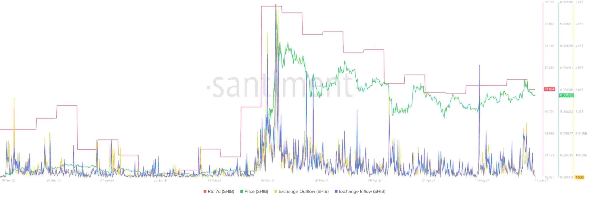 Estas métricas sugieren que los inversionistas están vendiendo activamente sus participaciones de $SHIB, con incluso las ballenas participando en esta tendencia. Esto fue evidente a partir de una ligera caída en la oferta de $SHIB en poder de las principales direcciones en los últimos siete días.