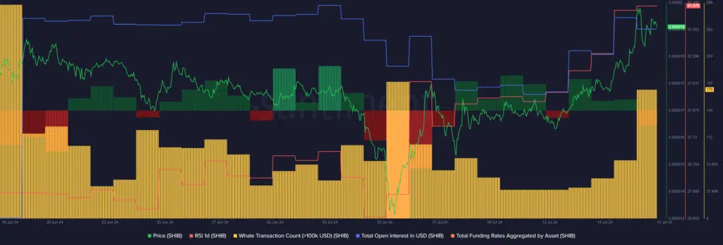 - A pesar de las impresionantes ganancias del 17% en la última semana, los volúmenes de negociación diarios de Shiba Inu han caído un 32%, mientras que las transacciones de ballenas que implican al menos 100.000 dólares en $SHIB han aumentado un 121%.