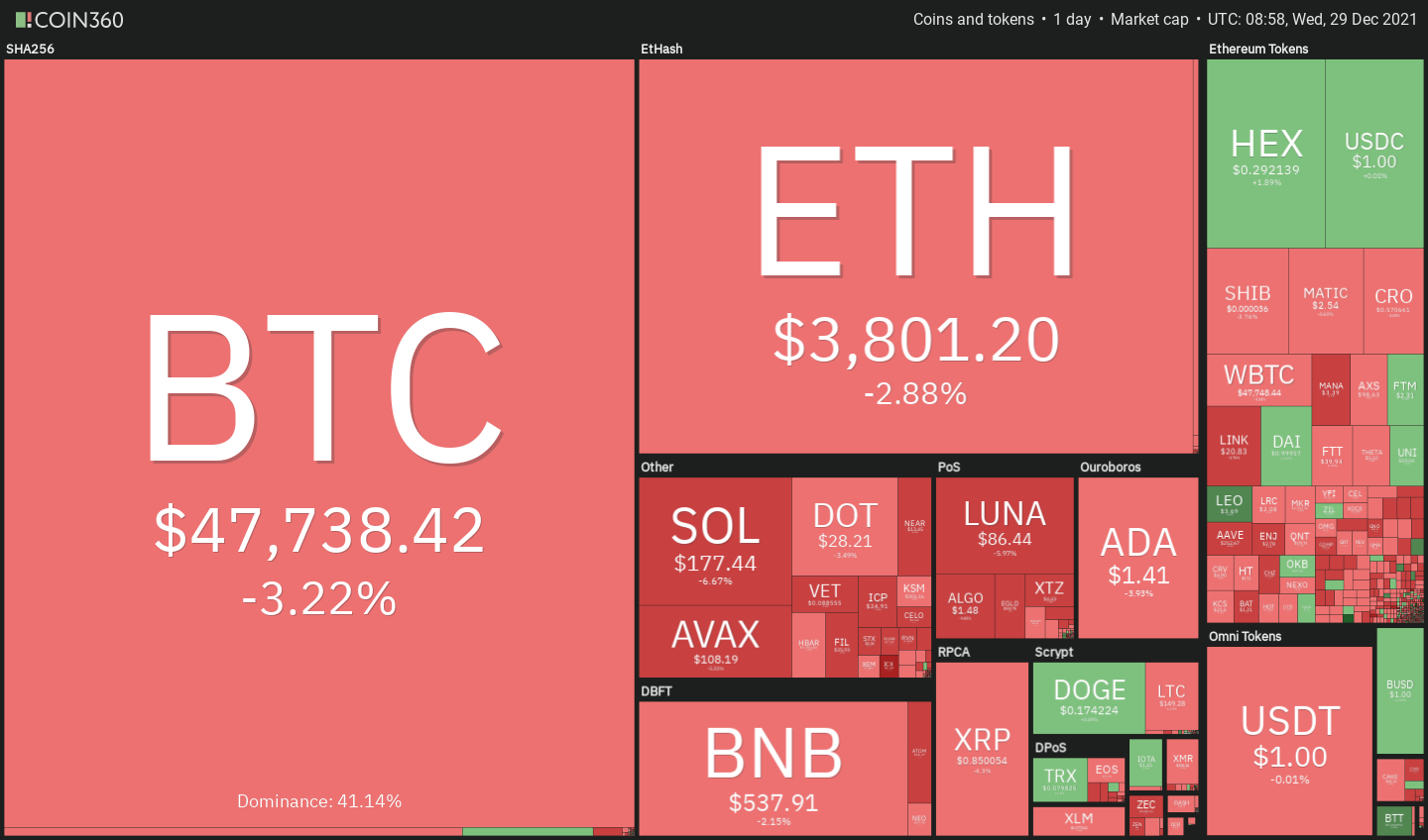 Las luchas del mercado de criptomonedas en general se han reanudado debido a una disminución del 3.2% en el precio de BTC en las últimas 24 horas. La moneda líder en el mercado se cotiza actualmente por debajo de los 48,000 USDT, ya que muchas altcoins experimentan caídas más severas. La capitalización general del mercado de criptomonedas se redujo casi un 3% durante ese mismo período de tiempo.