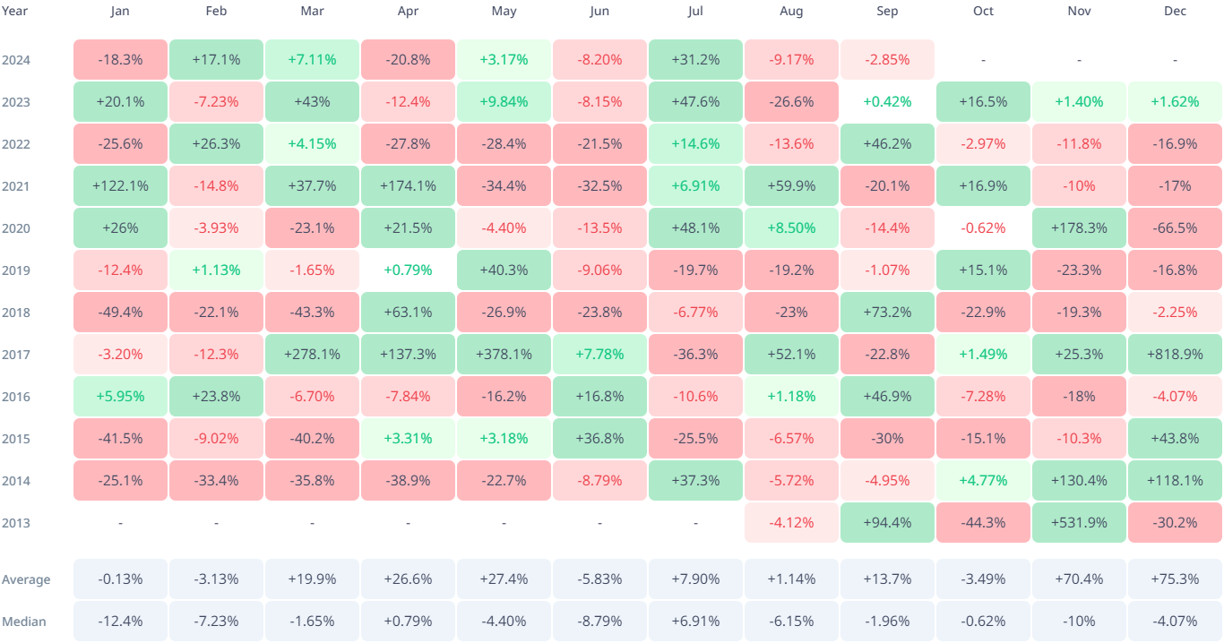 La historia de XRP ha visto actuaciones notables, especialmente en septiembre. En 2013, la criptomoneda XRP registró un aumento del 94.4%, logrando su mayor salto en septiembre. En los últimos años, ganó 46.9%, 73.2% y 46.2% en 2016, 2018 y 2022, respectivamente.