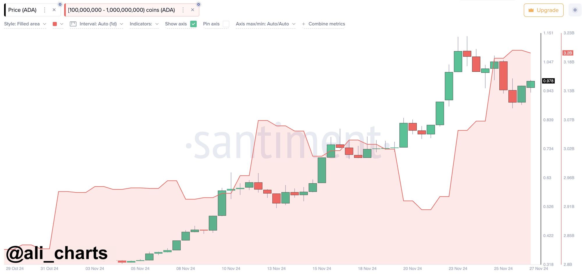 Los datos recientes muestran esta acumulación agresiva de $ADA por parte de las ballenas durante la caída. Esto es un testimonio de la fuerte creencia de que el potencial de rebote y la futura apreciación podrían estar a la vista. Una sólida confianza que respalda los fundamentos y la trayectoria futura del precio, la adquisición valorada en aproximadamente 130 millones de dólares lo subraya.