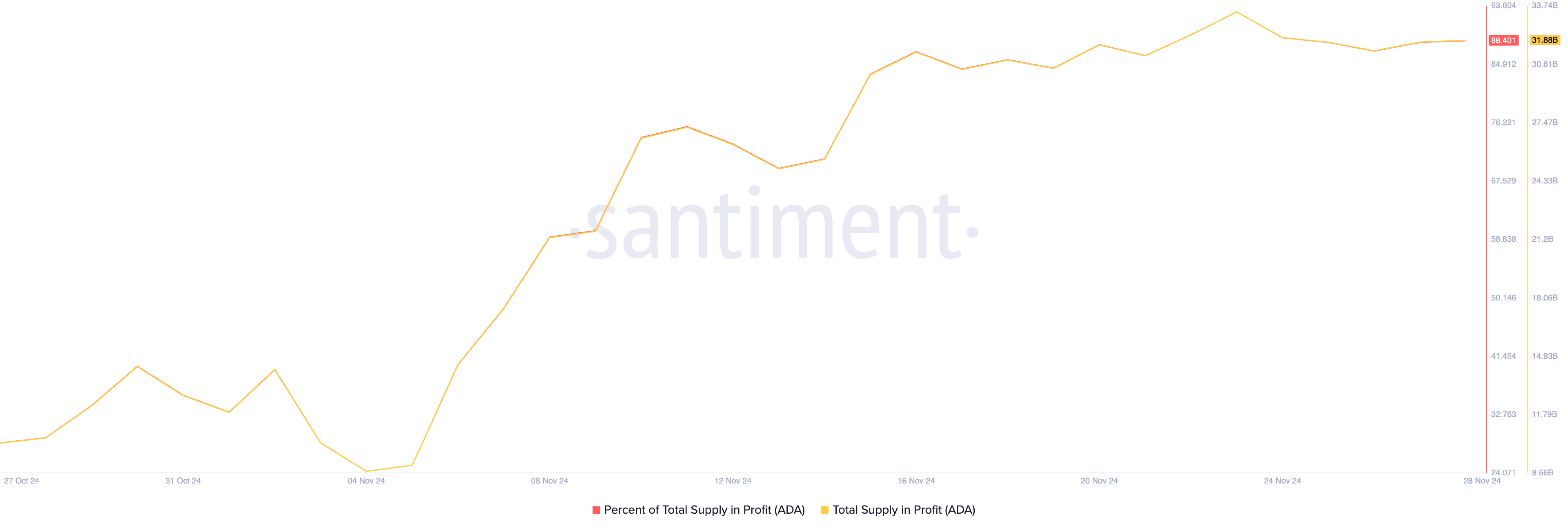 A los precios actuales del mercado, los inversores tienen 32 mil millones de tokens $ADA con un valor de 31 mil millones de dólares en ganancias, representando el 88.40% del suministro en circulación de $ADA.